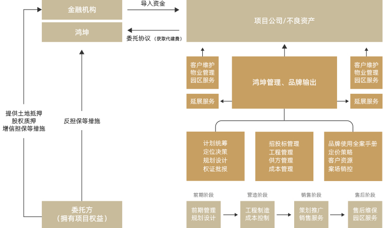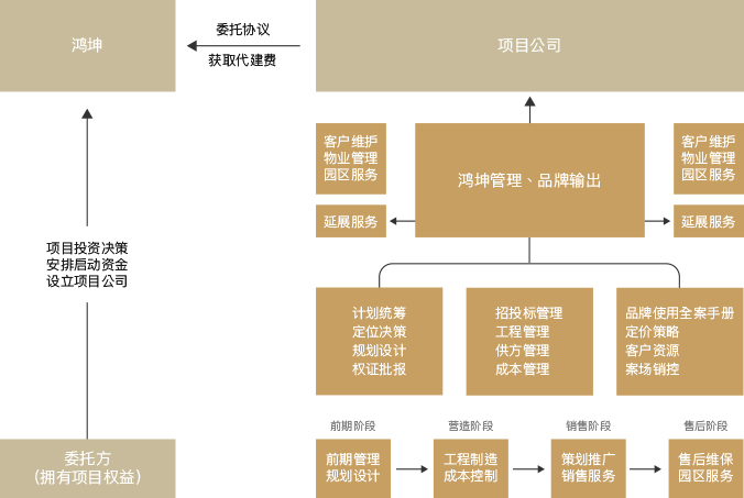 根據委托方需求,提供從土地獲取、產品設計、開發管理、工程營造、銷售管理等全周期服務,包括授權使用鴻坤品牌、派駐鴻坤專業團隊、執行鴻坤產品標準;