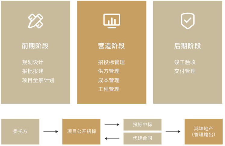 政府采用邀請、公開、指定等方式進行招標,選擇具有技術性、專業性的項目代建管理單位,鴻坤依托強大的專業資源整合能力與品質把控能力,對政府代建項目進行全過程管理